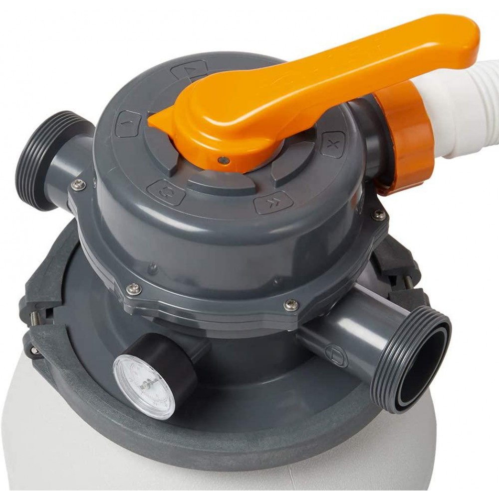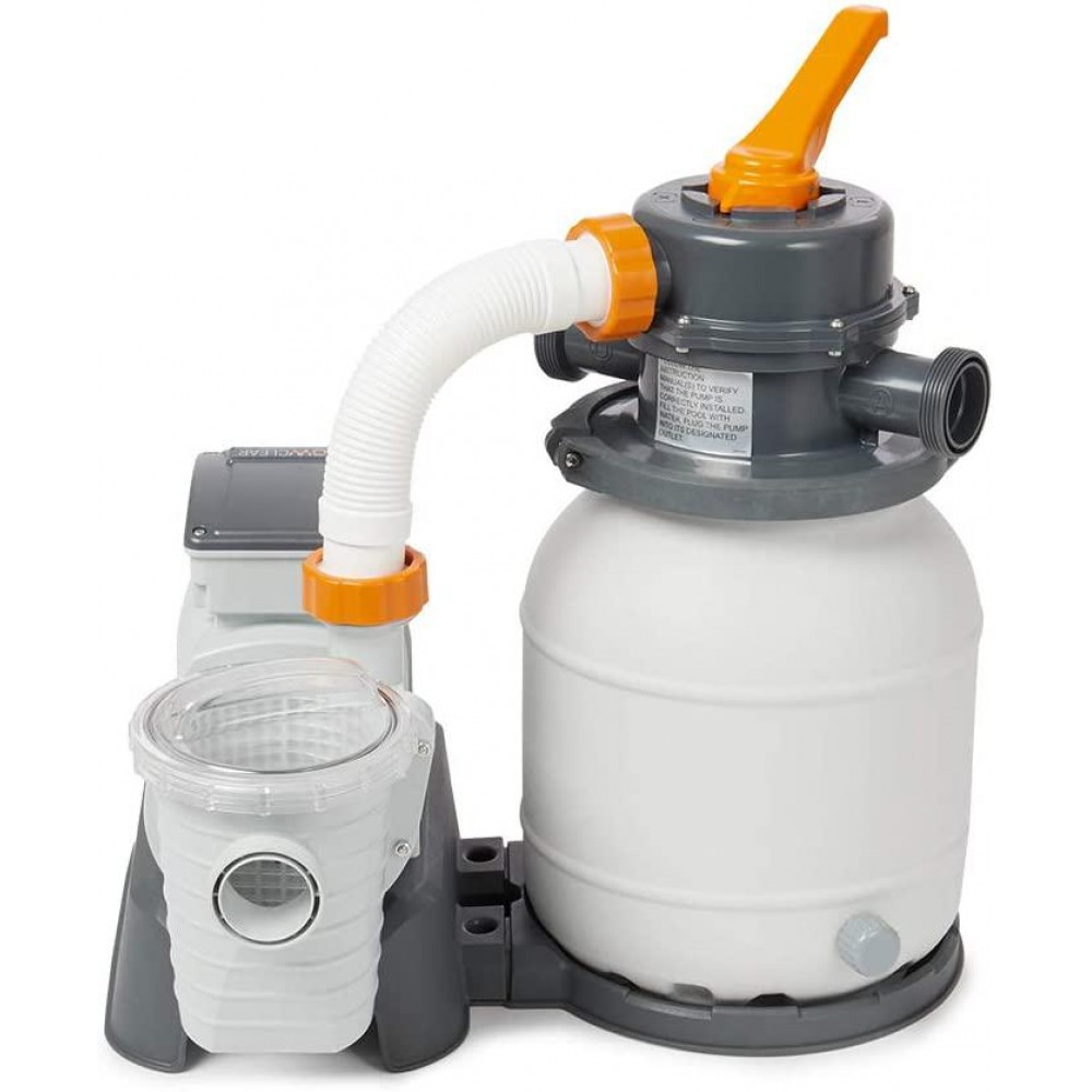 - Uses sand/silica to filter water (Not included); No need to replace filter cartridges