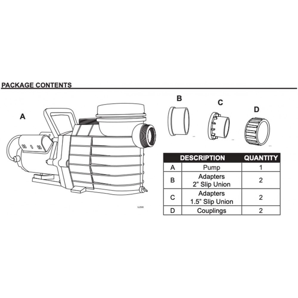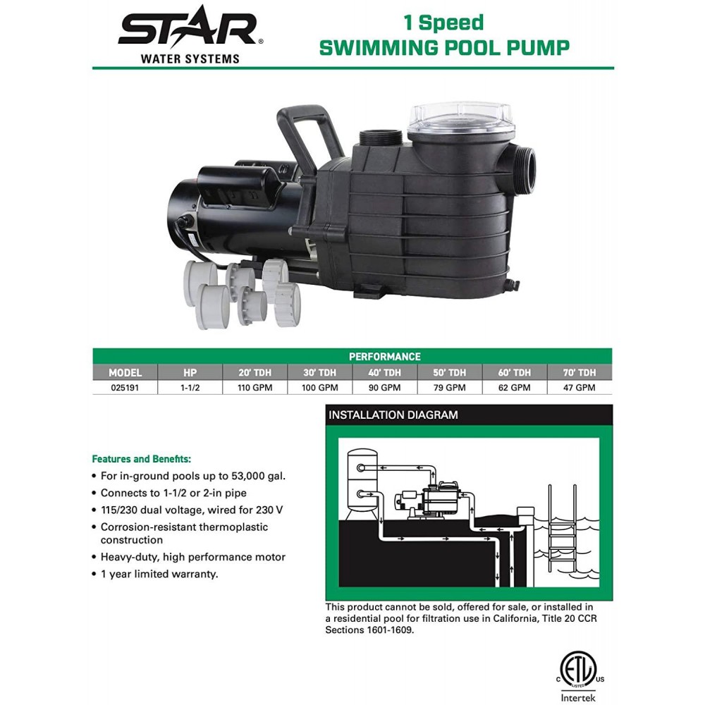 • QUICK & EASY TO INSTALL – Comes with all hardware required to install to existing 1-1/2 inch or 2-inch pipe; Includes pool pump, (2) 2” slip union adapters, (2) 1.5” slip union adapters, (2) couplings, and is covered by Star Water Systems 1 year limited warranty)