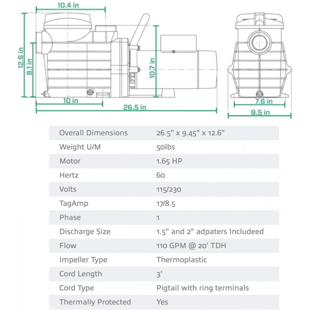 • 1.5 HP HEAVY-DUTY, HIGH PERFORMANCE MOTOR – Cool running single speed pool pump with dual voltage motor works on either 115 or 230 voltage and is factory wired for 230 volt; 1 phase